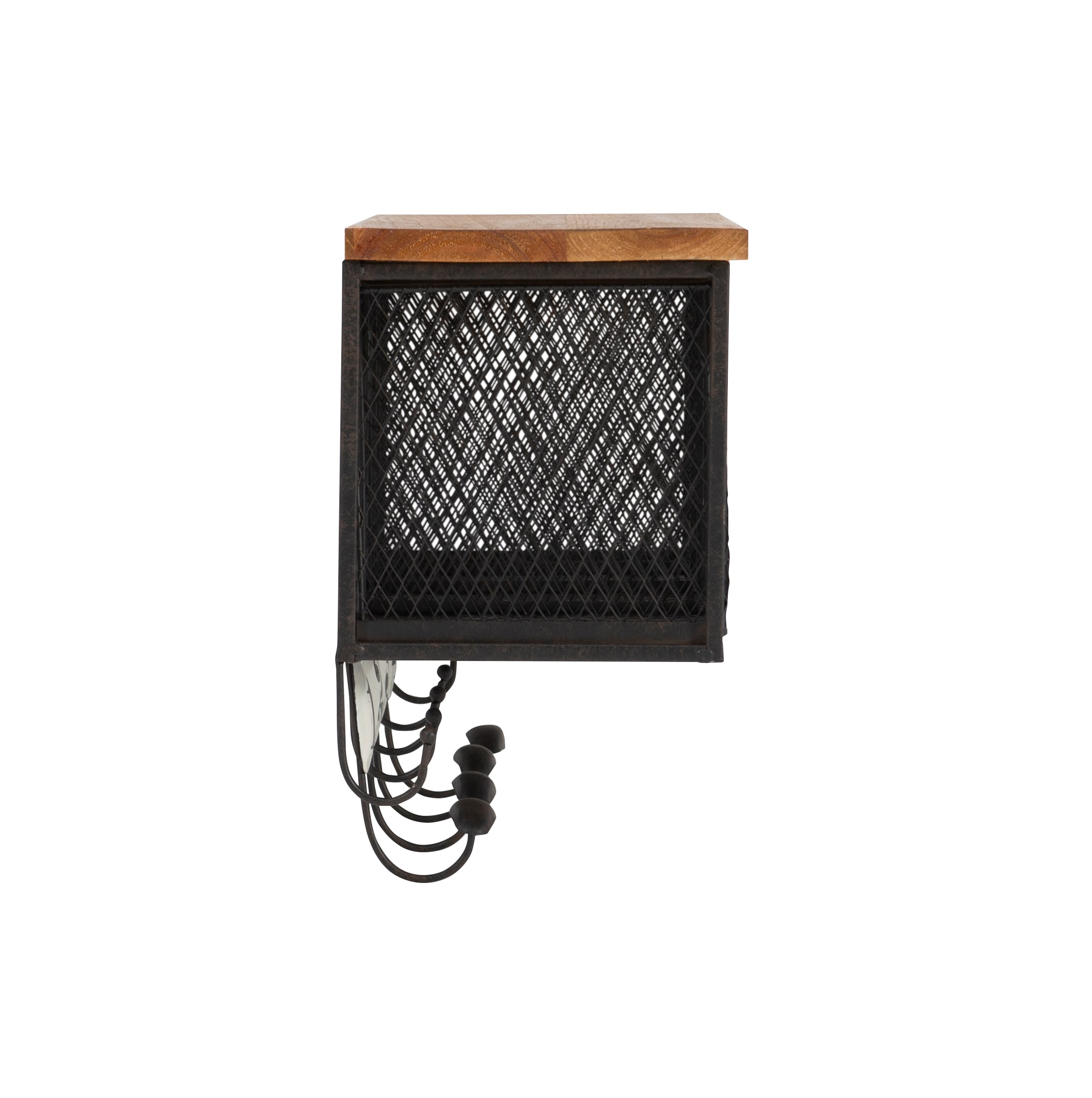 Four baskets pull out for storage: 5.125"x6.5"x6.5", 80% Metal Wrought Iron, 20% Firwood, Ideal for an entry, hall, mud room or office., Complements a variety of design styles., Nine Storage Hooks, Hangs on the wall for space saving storage., Hangs on wall vertically, Antiqued Stained Wood Top
