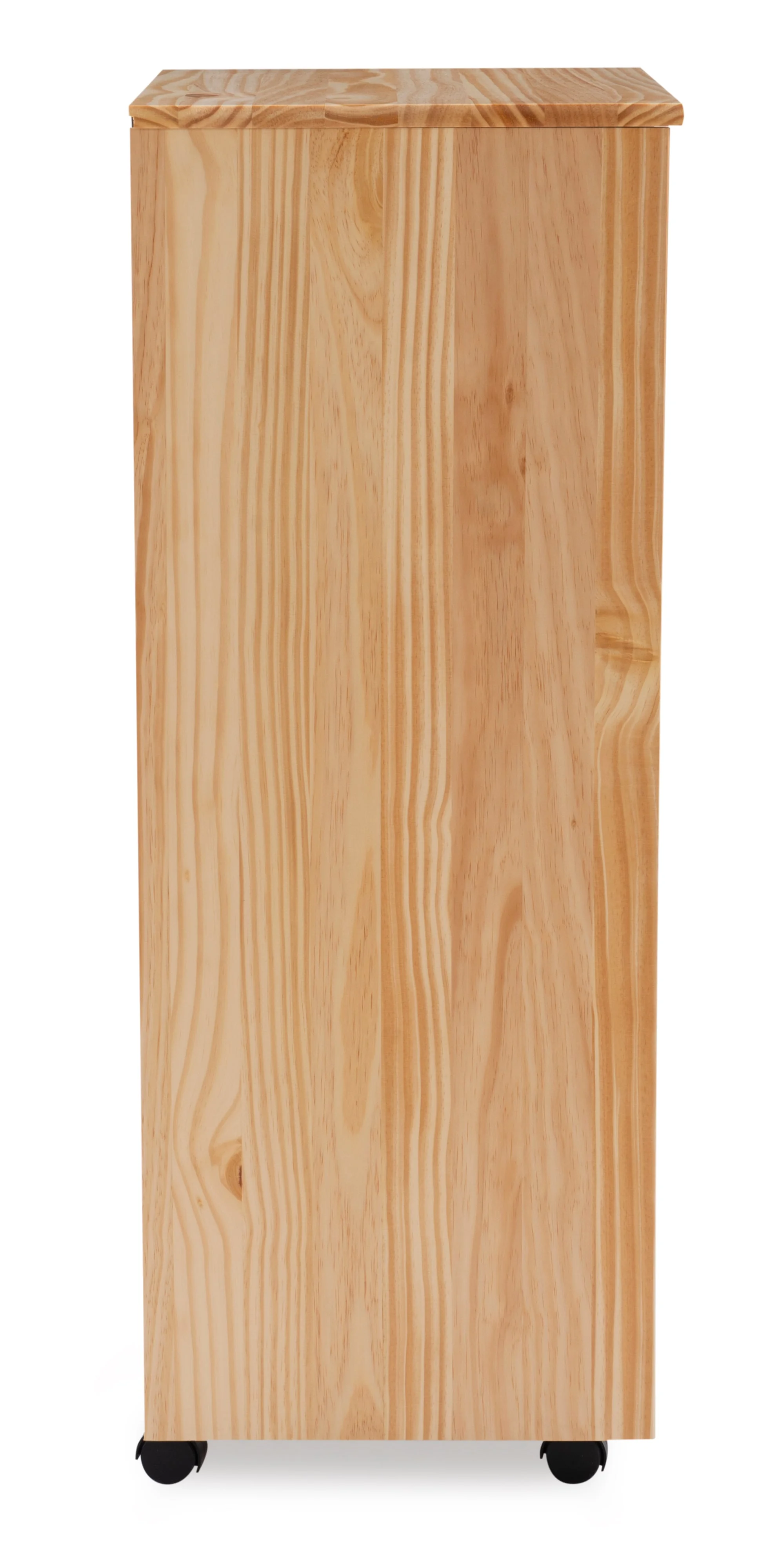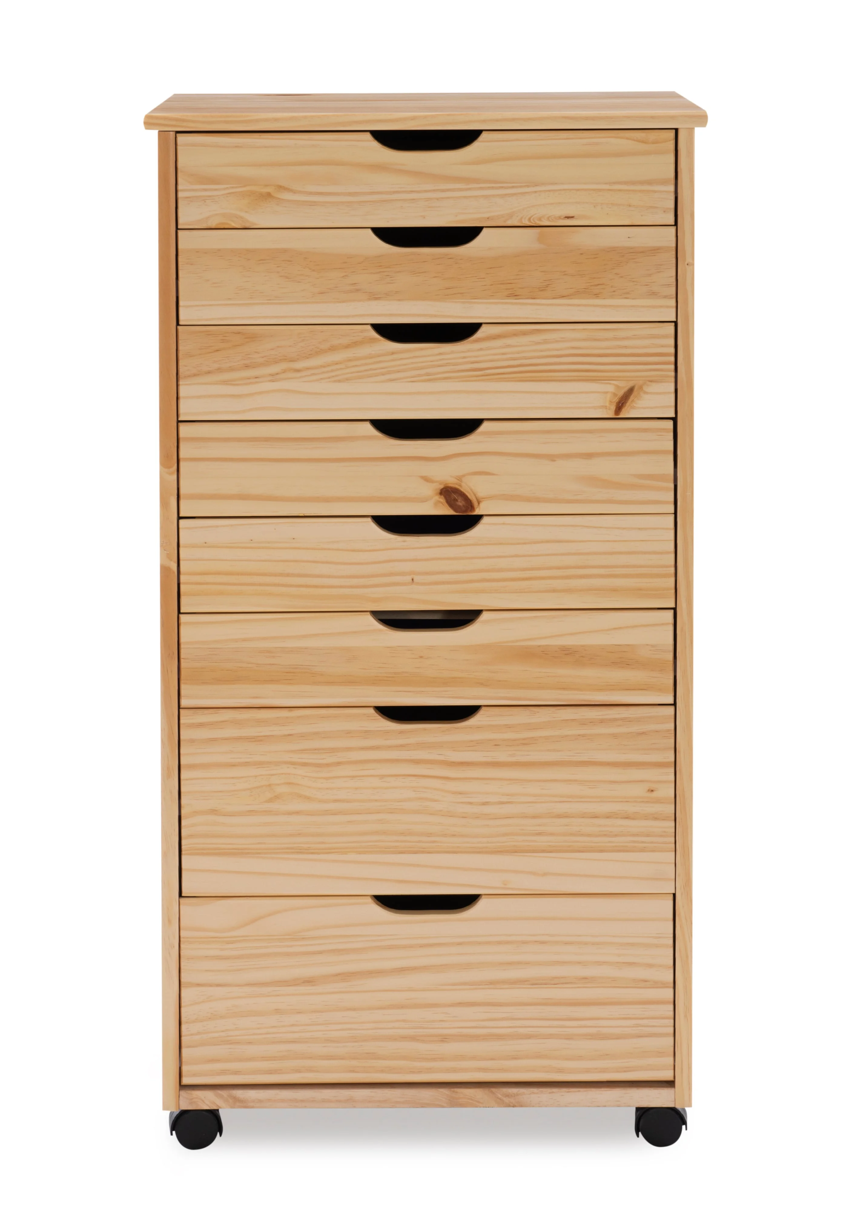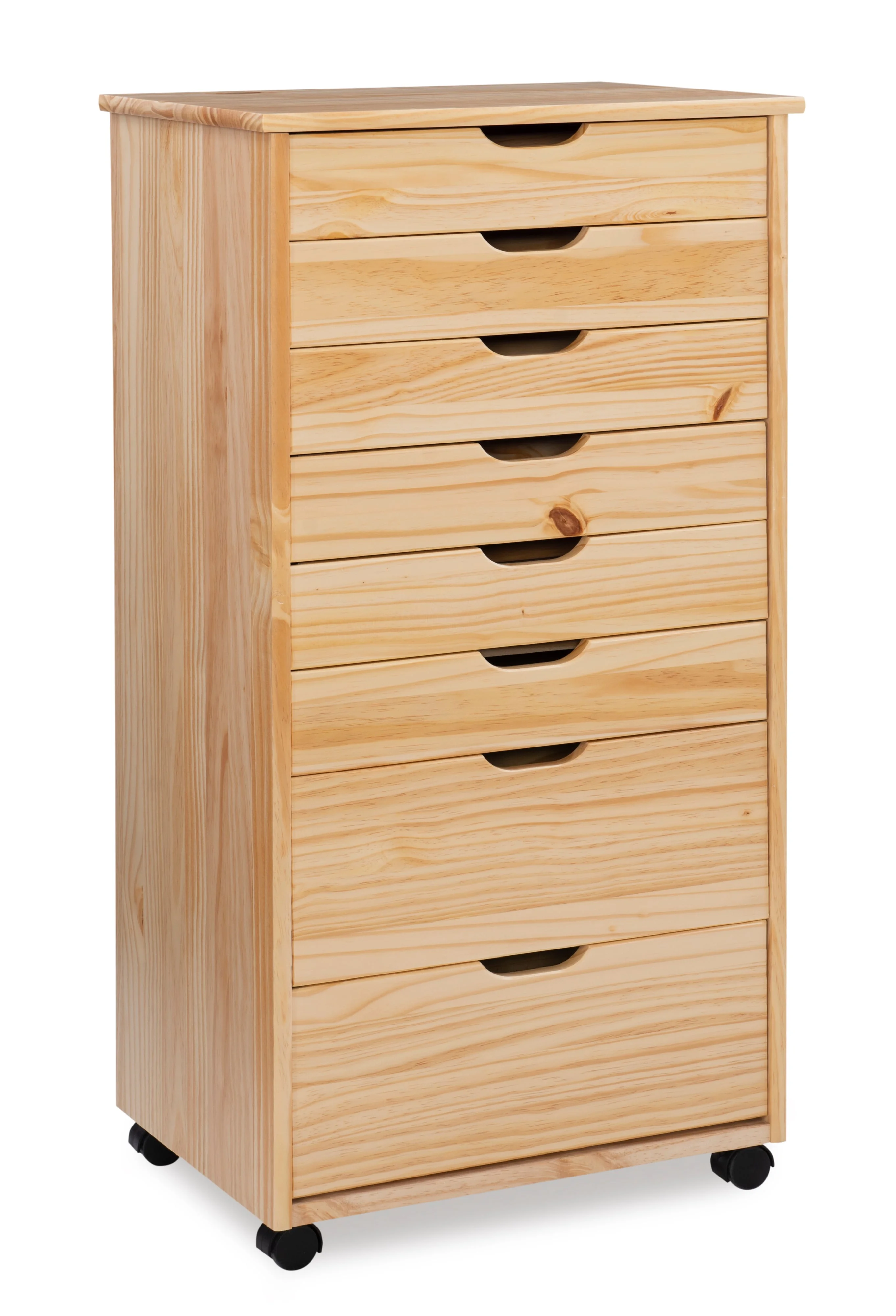moreThe Cary Eight Drawer Rolling Storage Cart is a versatile storage solution for Office, Kitchen, Bedroom or anywhere where organization is needed. In a natural finish that will allow this mobile piece to blend into any décor. Six equal size and two deep drawers are finished off with ample top that can go next to a desk or craft table to put items within reach. Soft contoured handle cut outs is easy on the touch and creates a clean, modern look. Drawers can be easily removed and used as a tray to transport your items to your workspace. Casters make this piece mobile to go into any room easily.