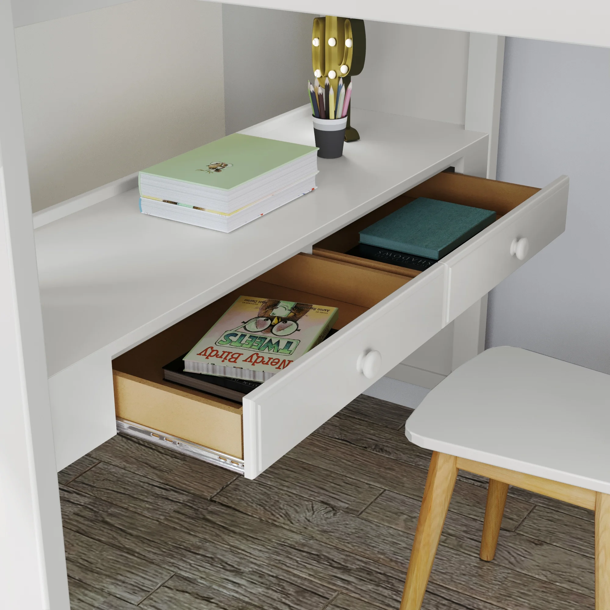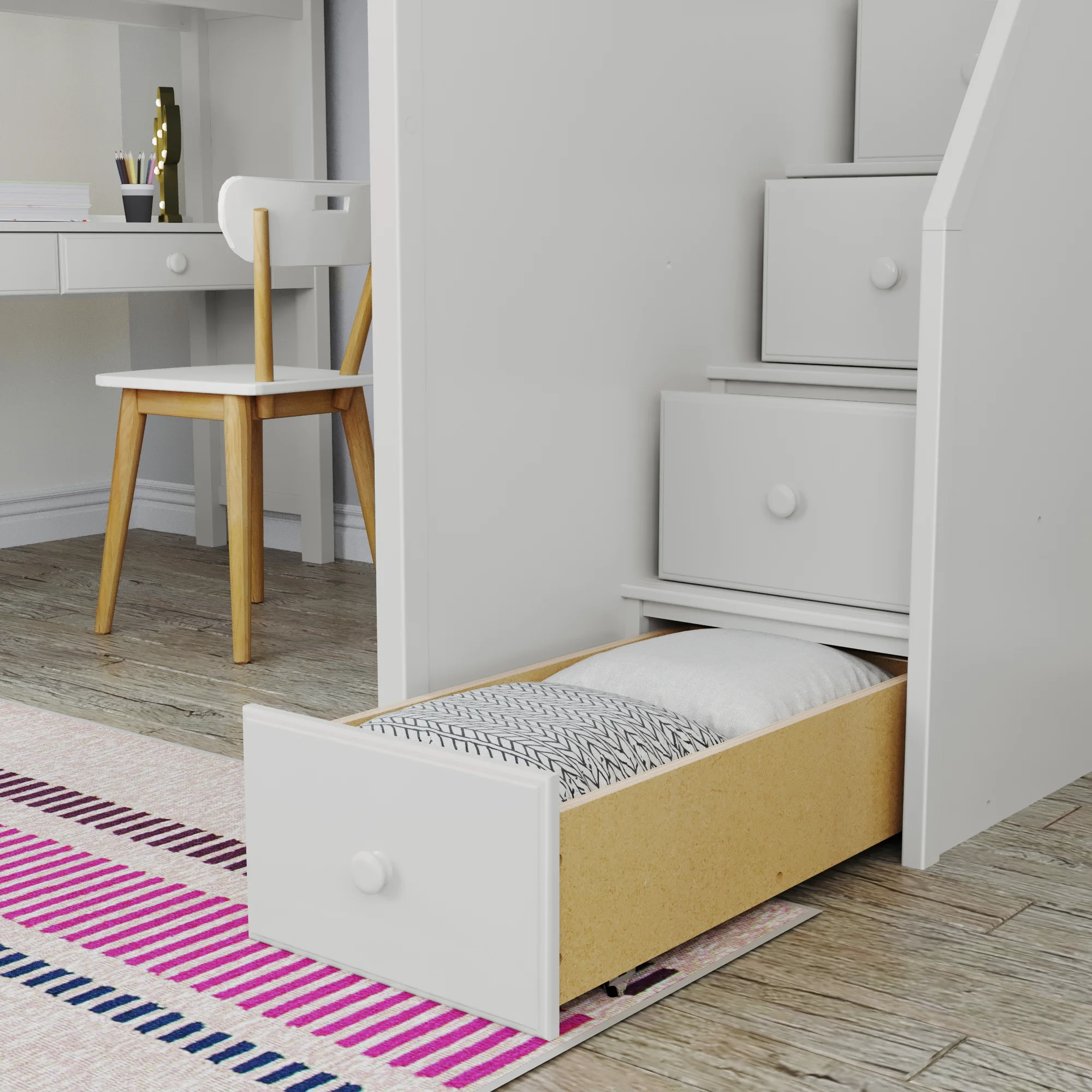 - Easy-access, safe staircase double has storage -- housing (4) drawers for bedroom essentials