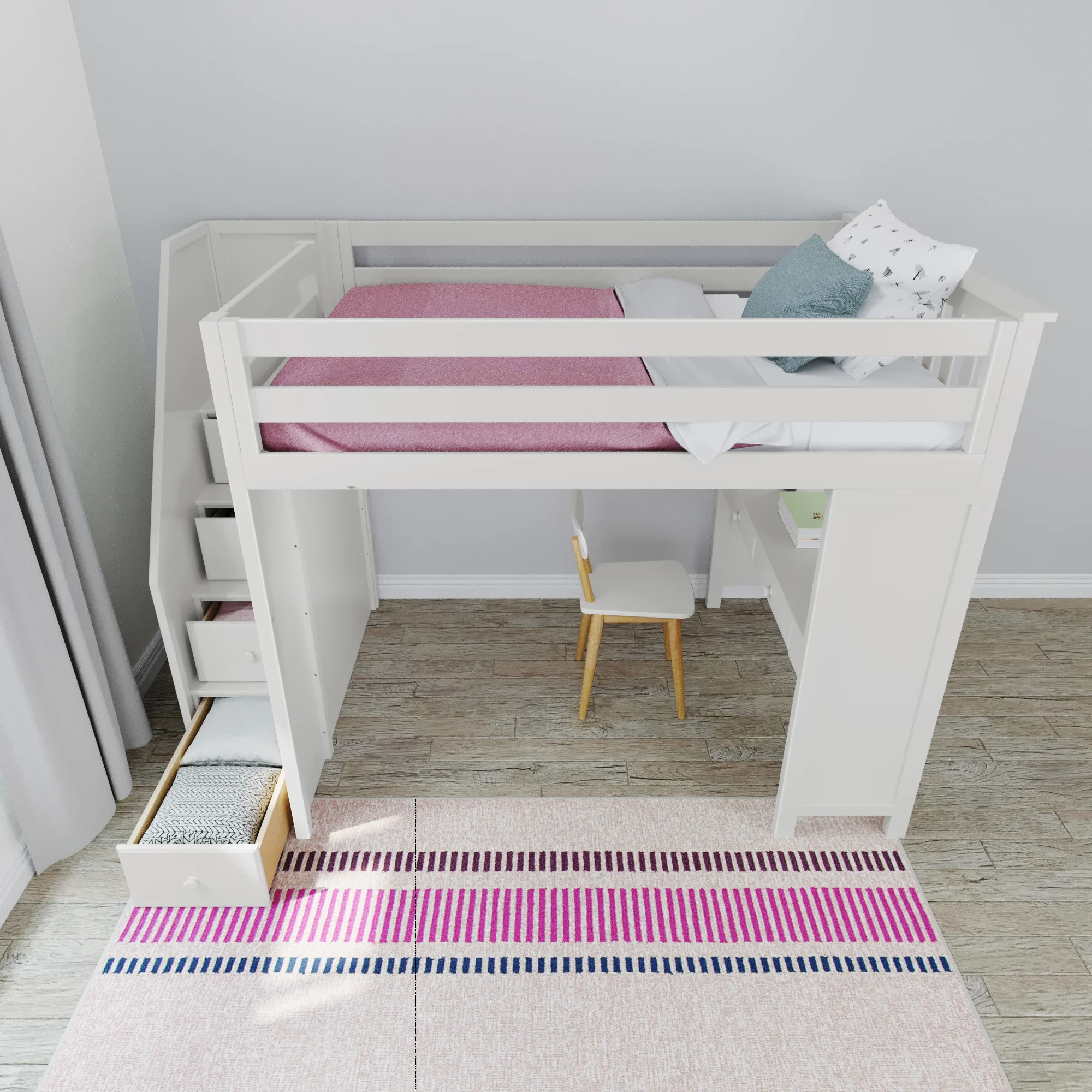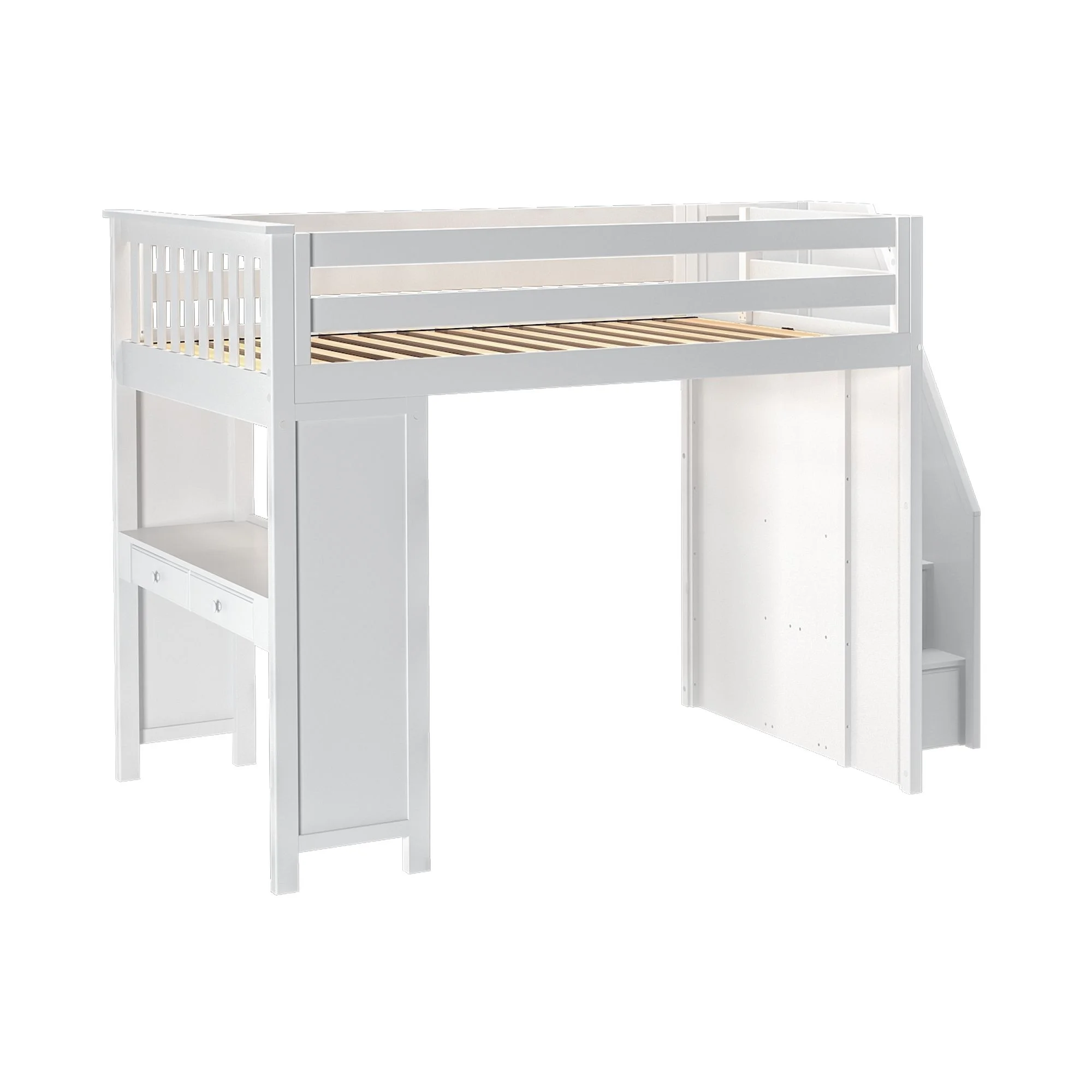 The loft bed comes with a convenient staircase that makes it easy for kids to climb up and down, and a built-in desk that provides a dedicated space for homework, reading, or creative activities. The solid wood composition ensures that the bed is stable and secure, giving parents peace of mind.