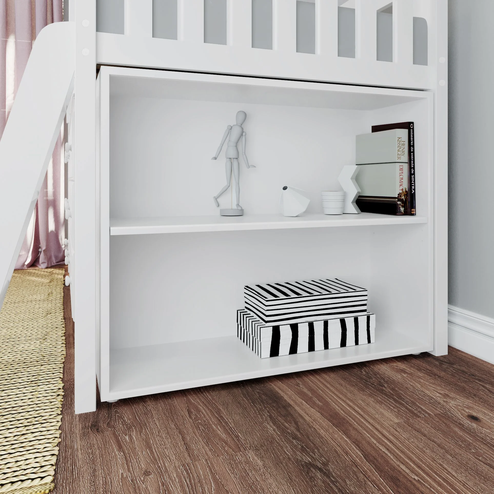 The loft bed's design allows for a comfortable sleeping area while keeping the floor clear for play or relaxation. The solid wood construction ensures durability and stability, giving you peace of mind. The white finish adds a touch of innocence and purity, creating a soothing atmosphere in the bedroom. With its excellent storage capabilities and cozy sleeping area, this loft bed is an excellent choice for kids' bedrooms, promoting a sense of organization and tranquility.